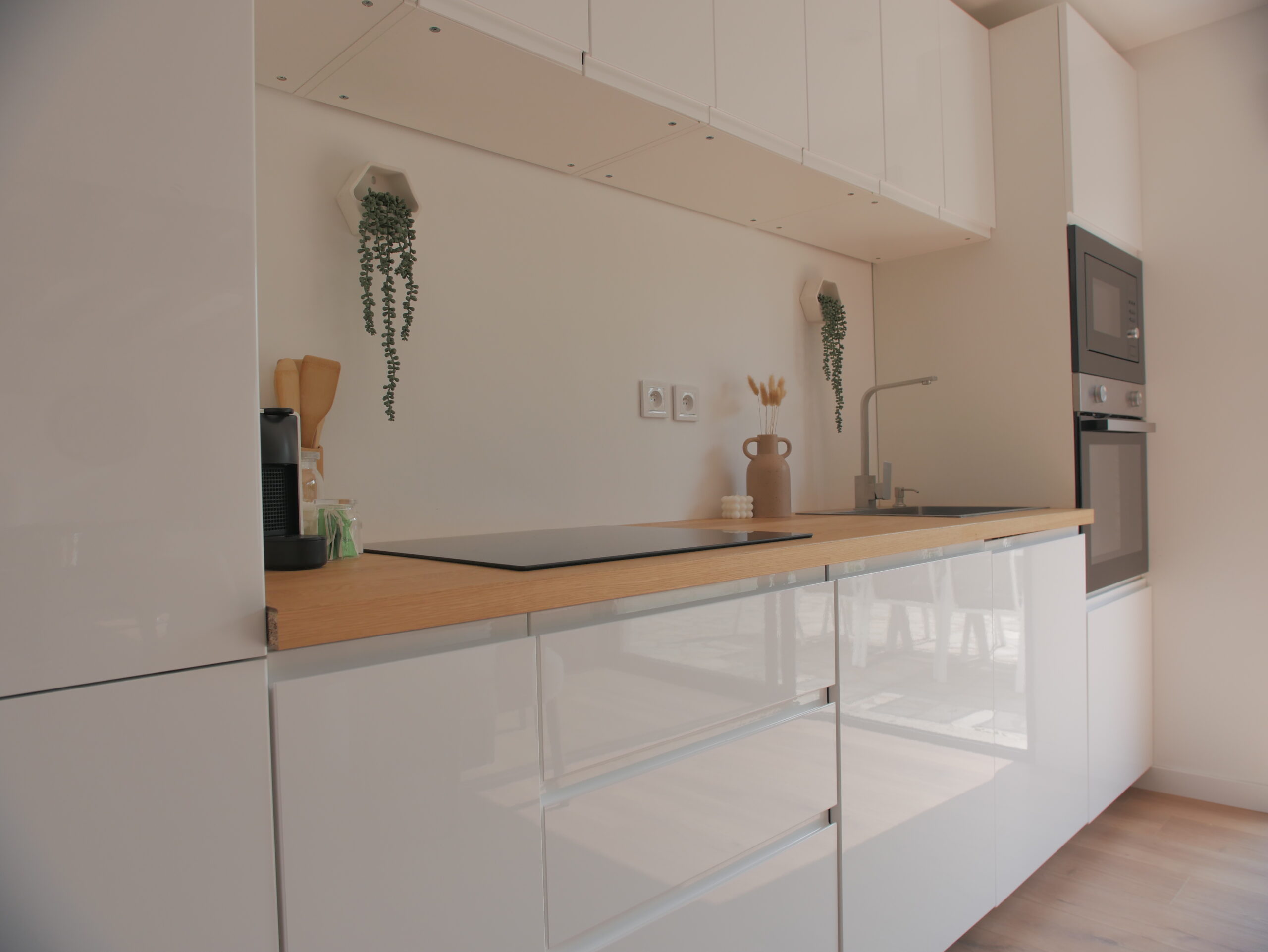 La cuisine ouverte, entièrement équipée, allie modernité et convivialité, offrant un espace fonctionnel et connecté au salon.