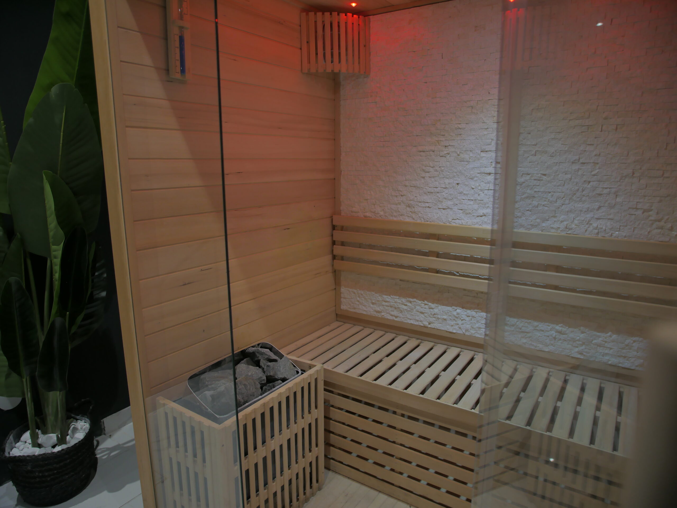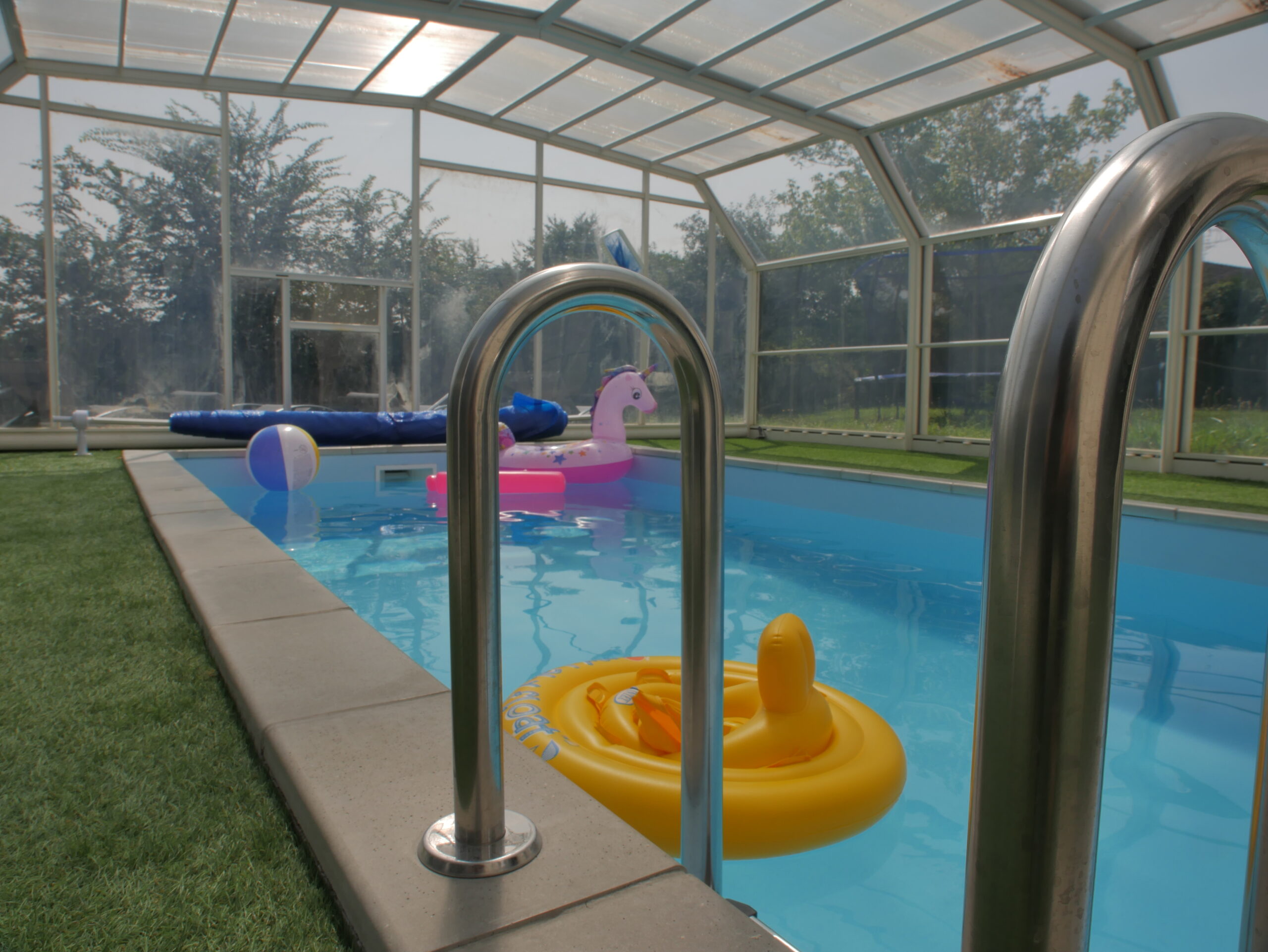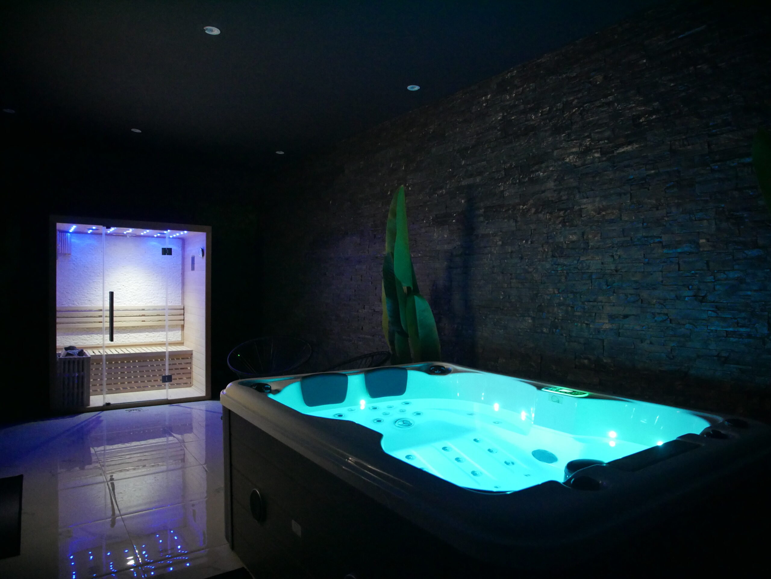 Le coin spa et piscine couverte offre une baignade chauffée en hiver avec vue sur le jardin. Le spa adjacent, avec sauna et bain à remous, assure une détente totale sans aucun vis-à-vis.