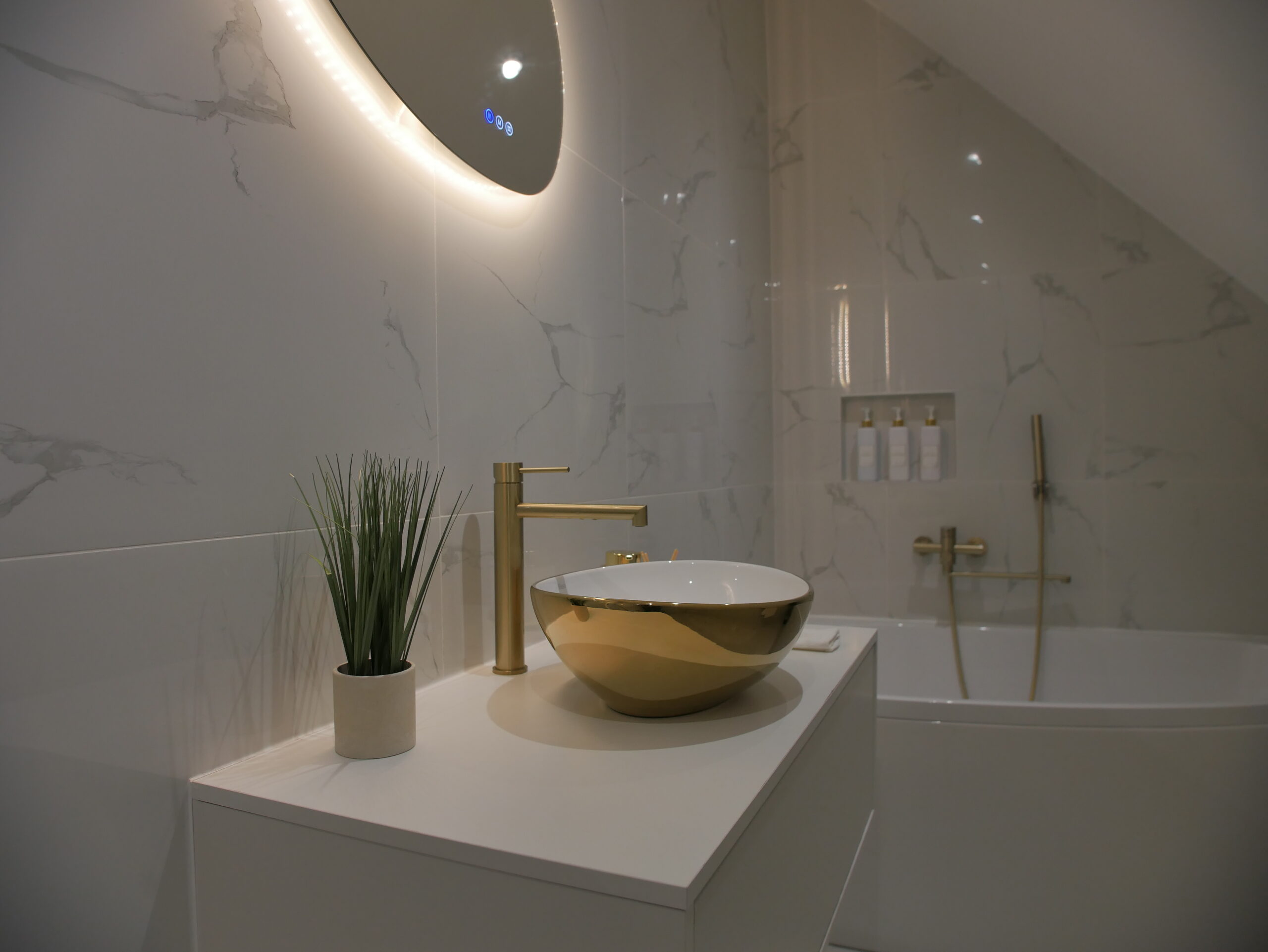 Les deux salles de bain, modernes et cosy, incluent une douche à l’italienne et une baignoire. Shampoing, gel douche et serviettes sont fournis pour un confort optimal